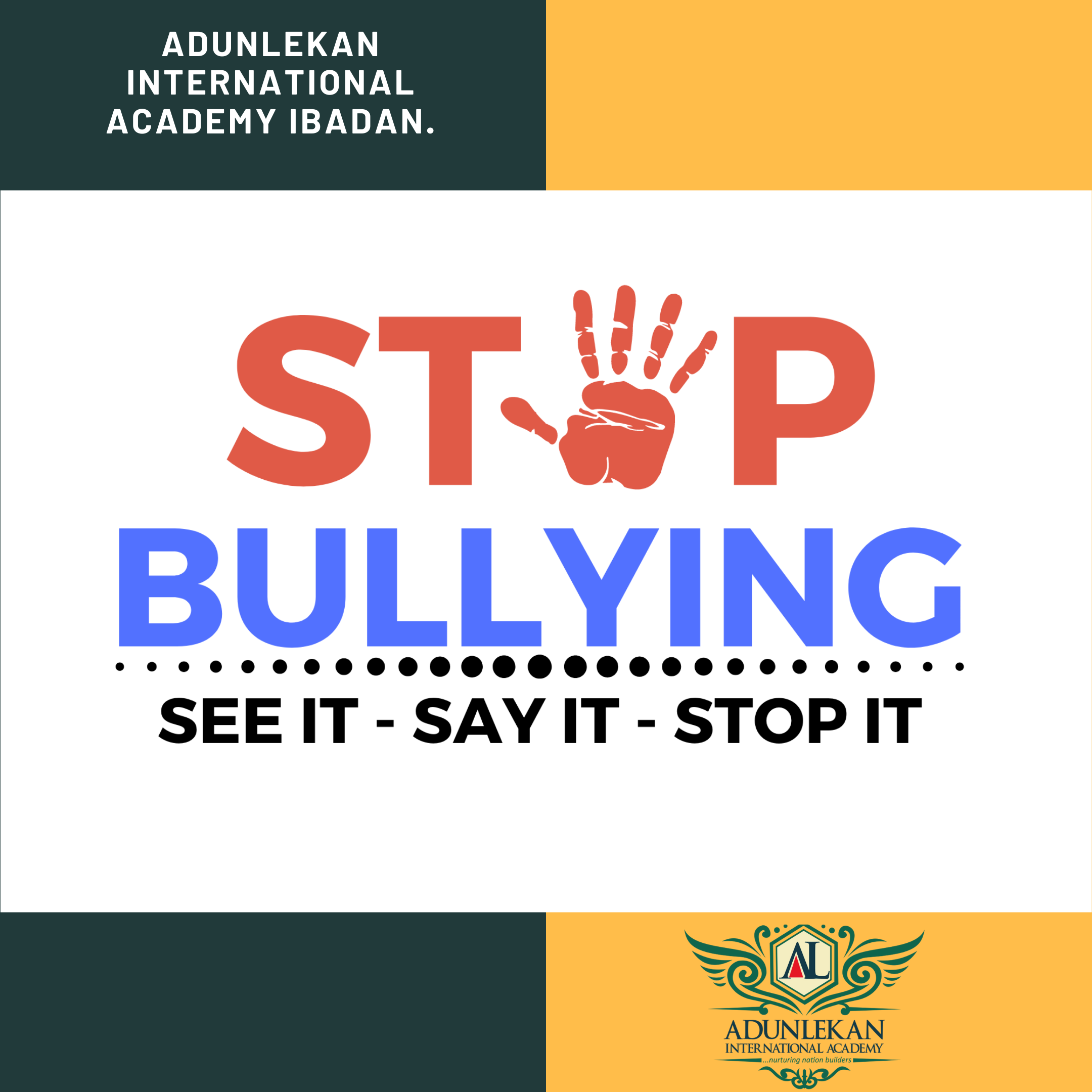 Principles and Values As a school we take bullying and its impact seriously. Students and parents should be assured that known incidents of bullying will be responded to. Bullying will not be tolerated. The school will seek ways to counter the effects of bullying that may occur within school or in the local community. The ethos of our school fosters high expectations of outstanding behaviour and we will consistently challenge any behaviour that falls below this. Objectives of this Policy All teaching and non-teaching staff, students and parents should understand what bullying is. All teaching and non-teaching staff should know what the school policy is on bullying and follow it when bullying is reported. All students and parents should know what the school policy is on bullying, and what they should do if bullying arises. All of us have encountered bullying at some point in our lives, but we all deal with it differently. The aim of this policy is to work together to ensure that our school is a safe place for children and adults to be; whether the school community is directly or indirectly affected by bullying or not. What Is Bullying? Bullying is unacceptable behaviour used by an individual or group, usually repeated over time, that intentionally hurts another individual or group either physically or emotionally. In other words, bullying at Adunlekan International Academy is, “unacceptable behaviour which occurs ‘lots of times, on purpose’.